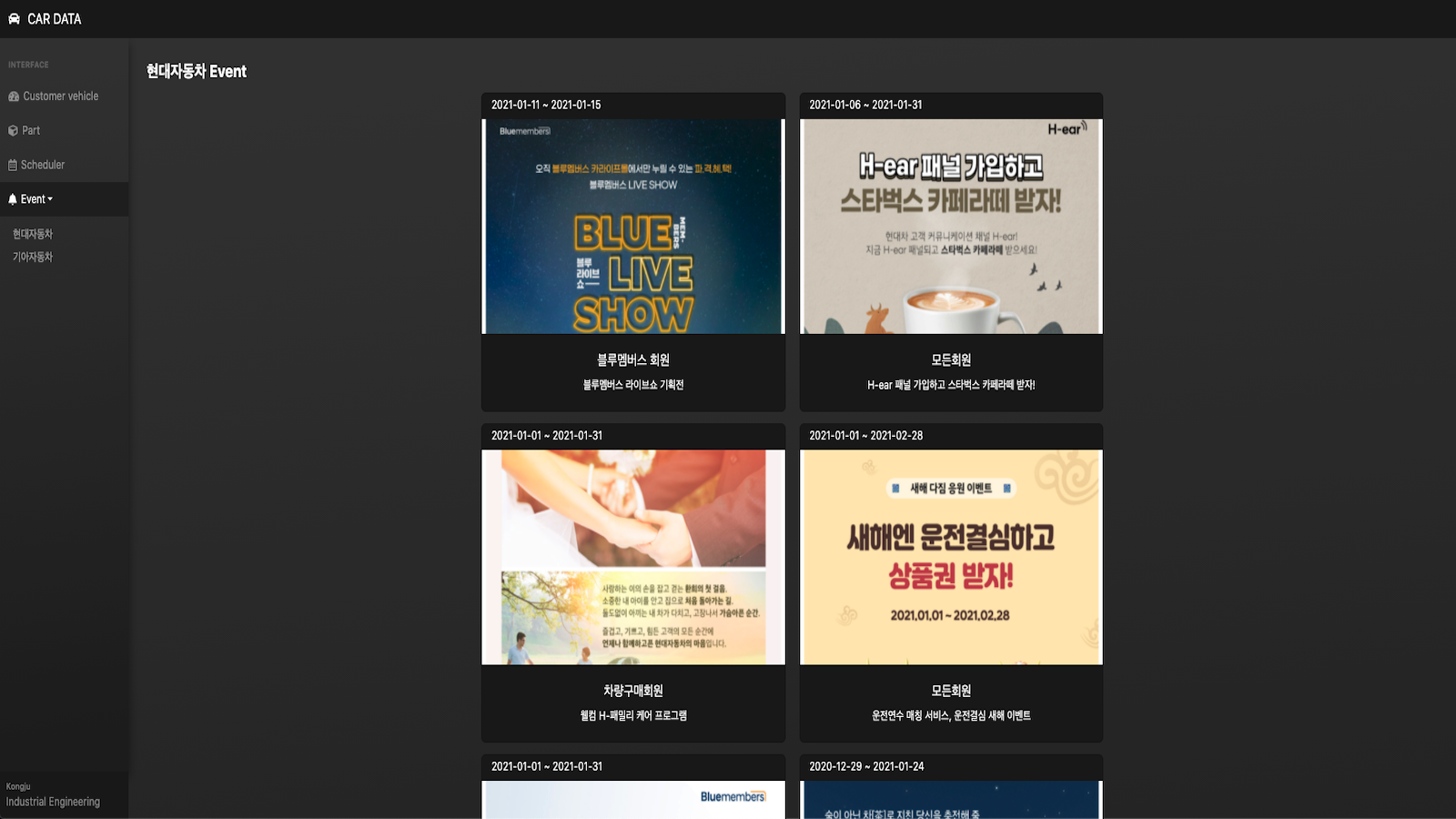 대학교 4학년때 자동차 수리점을 운영하시는 아버지를 보고 차량수리이력, 재고, 스케줄, 기타 소식을 크롤링하고 리포팅하는 사이트를 제작해보았습니다.